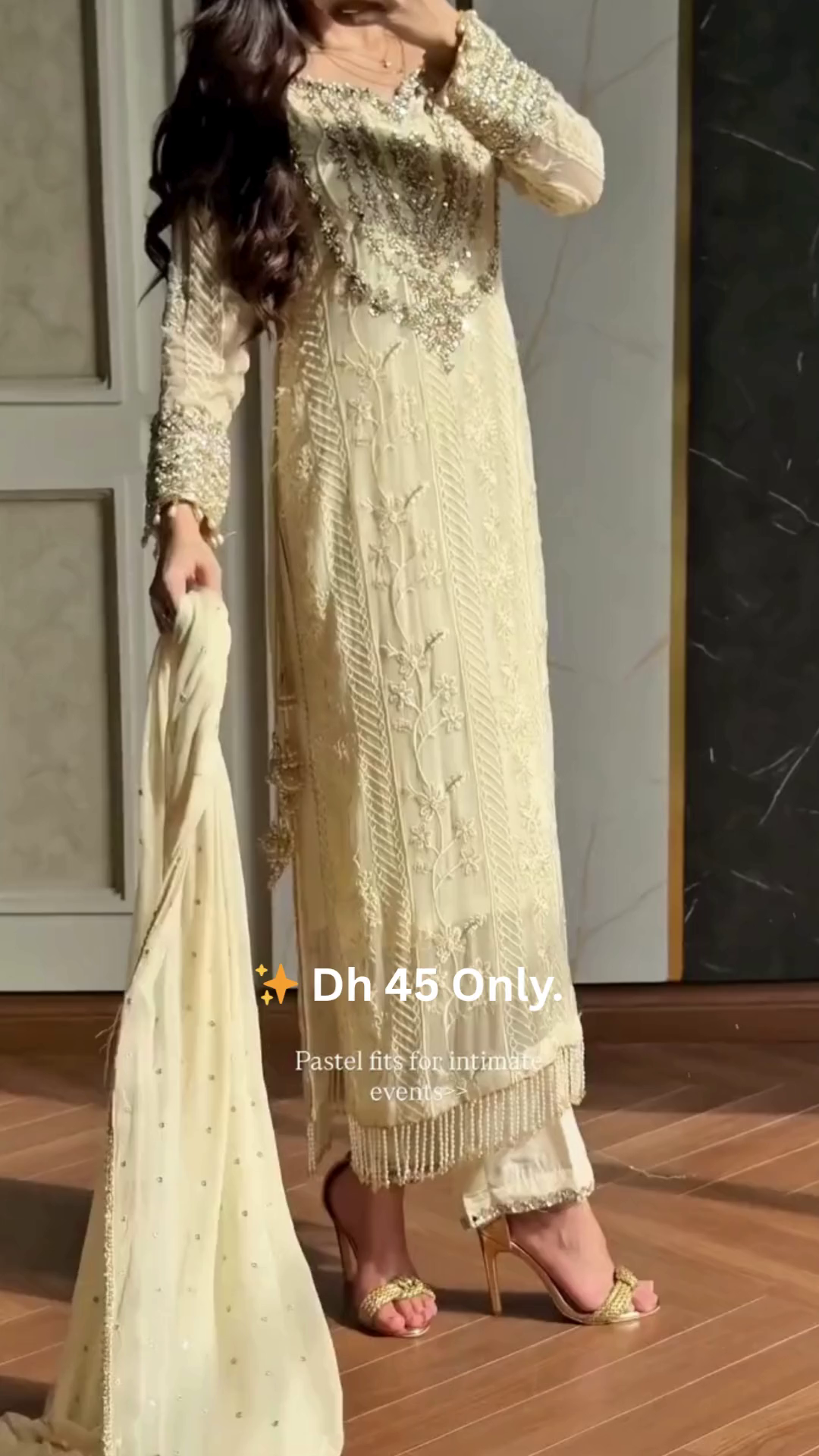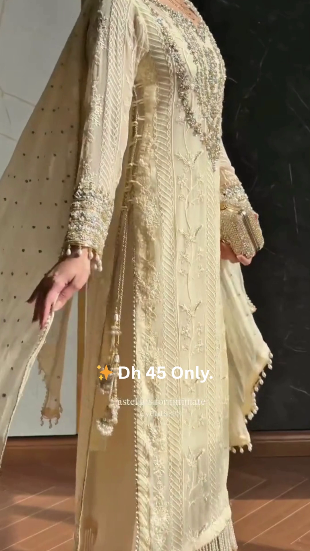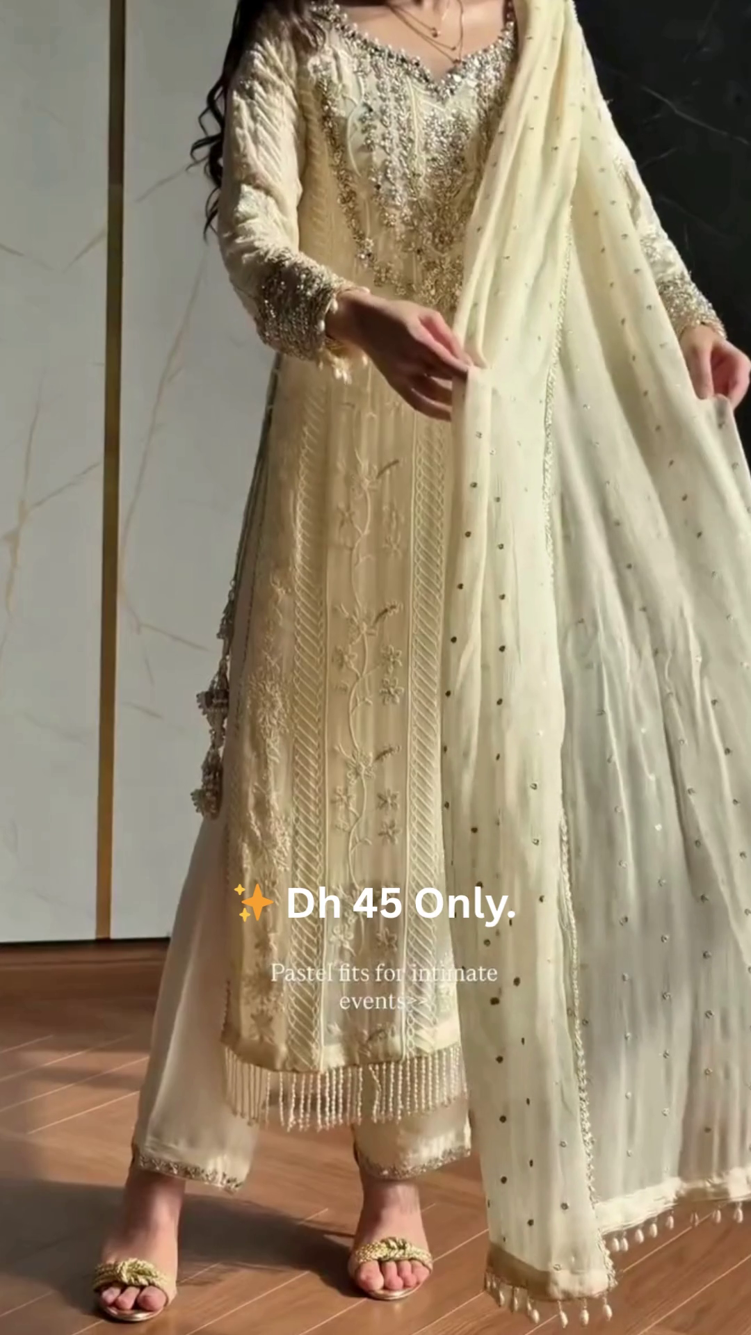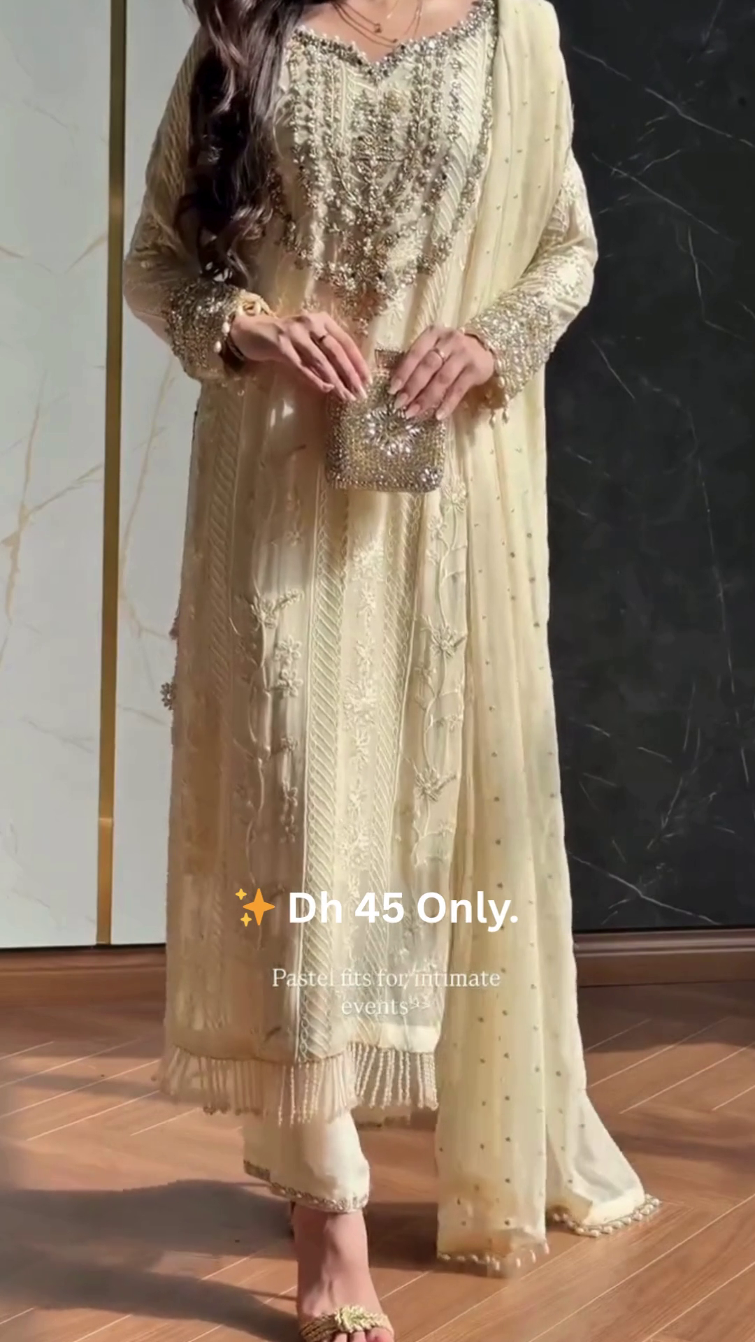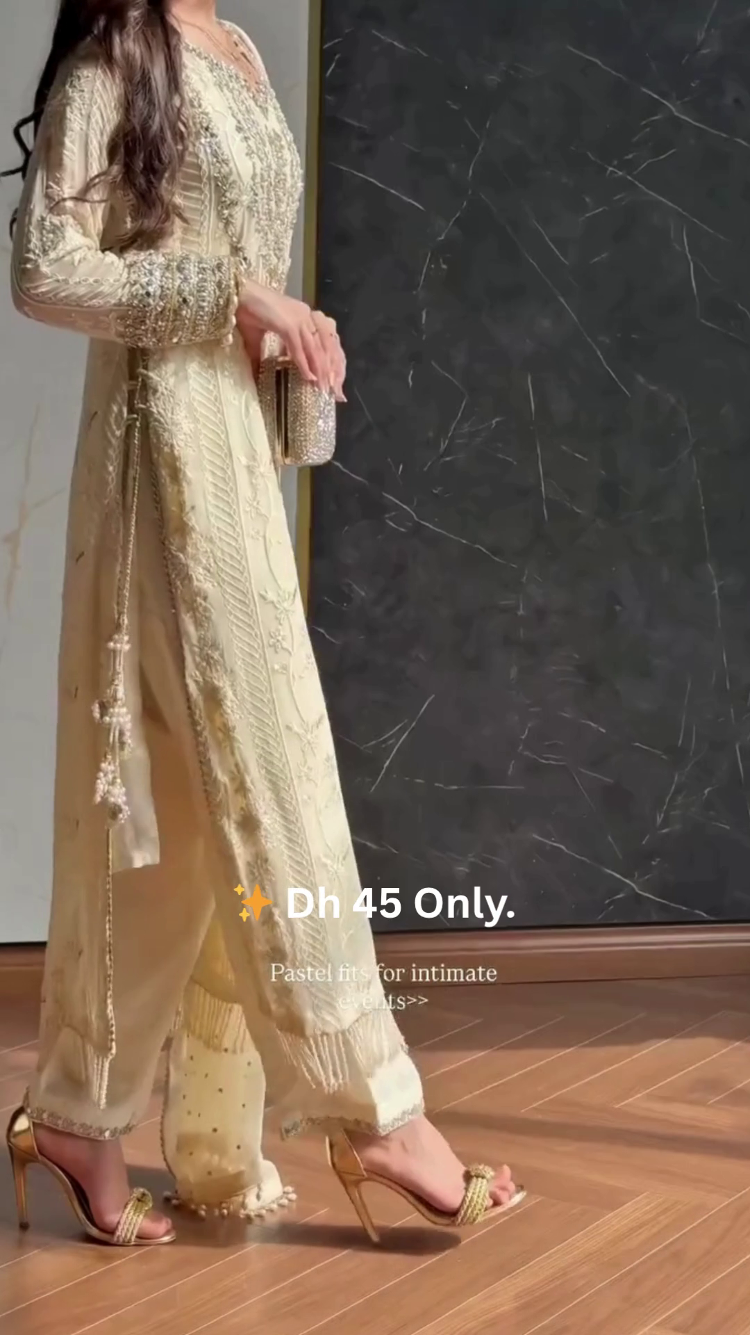 / ✨ Pastel Gold Embroidered Long Suit – Dh 45 Only